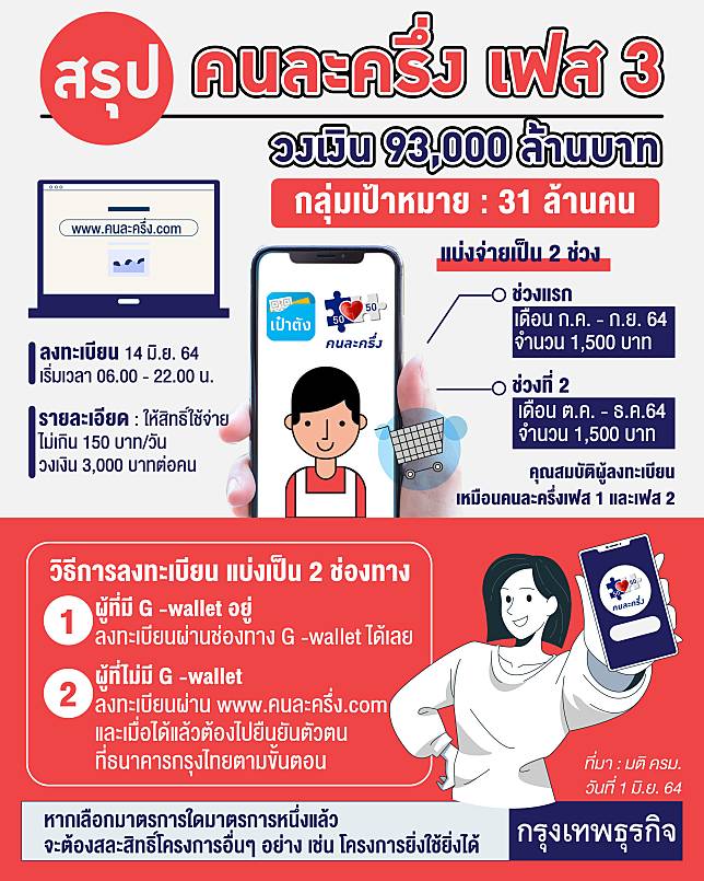 คนละคร งเฟส 3 จ ายเพ ม 3 000 บาท เป ดช องทางการลงทะเบ ยน ร บวงเง นผ านแอปฯเป าต ง